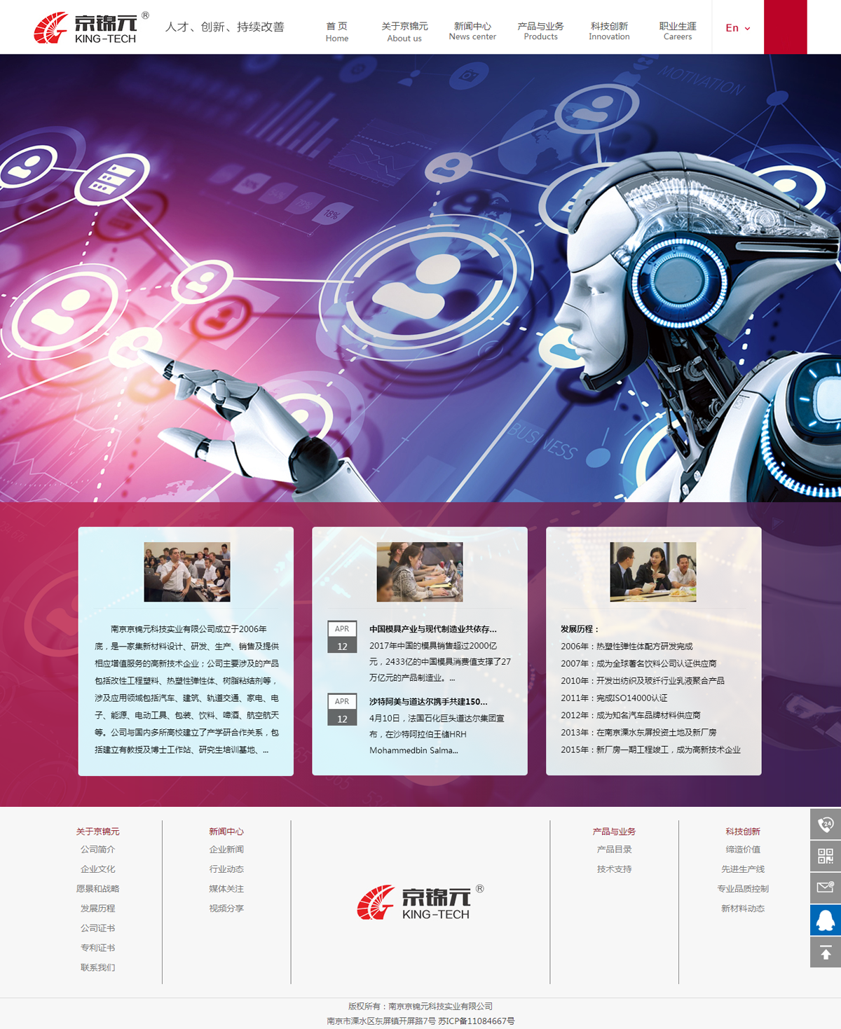 京錦元作為特種聚合物材料的供應(yīng)商,致力于彈性體包裝及包覆材料,因而我們開(kāi)發(fā)了以營(yíng)銷(xiāo)為主的布局形式,以市場(chǎng)的眼光來(lái)制作網(wǎng)站,包括設(shè)計(jì)思維都跟蹤這一要求,網(wǎng)站的整個(gè)架構(gòu)與頁(yè)面層為主,大banner設(shè)置在里層,外圍素材采用JS腳本加個(gè)動(dòng)態(tài)網(wǎng)頁(yè)效果,色塊均勻,內(nèi)涵豐富,底端顯示可用來(lái)鏈接的三級(jí)菜單,形象很直接清爽。