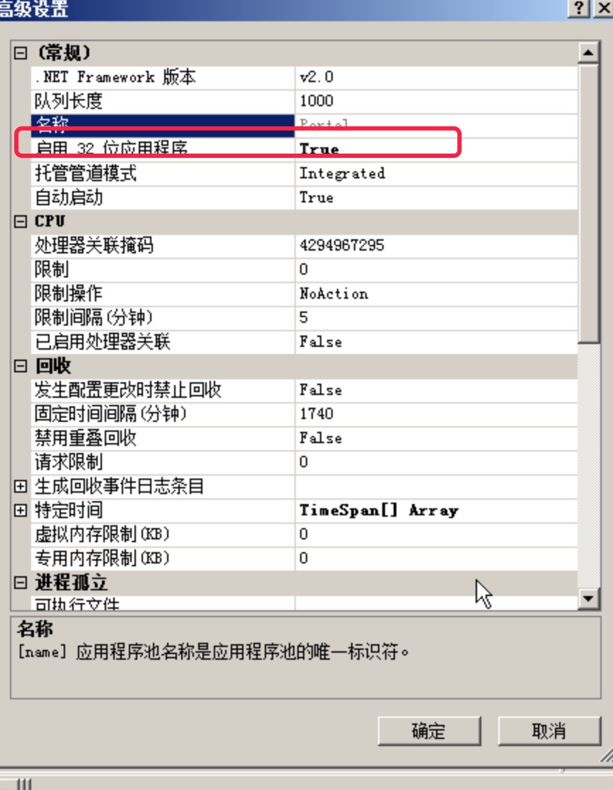 到后就到了高級設(shè)置頁面了,里面有一個啟用32位應(yīng)用程序,默認(rèn)狀態(tài)下是False,點擊它選擇True,意思是說IIS默認(rèn)啟動64位,現(xiàn)在啟動了32位,access就好用了,就能成功的調(diào)用數(shù)據(jù)庫了,后高級設(shè)置頁面附圖如下: